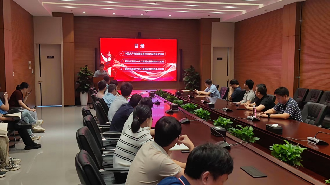 周海山做题为“党的作风建设永远在路上——深入贯彻中央八项规定精神学习教育,持续擦亮‘金色名片’”的专题党课。党课回顾了自新民主主义革命时期起中国共产党加强自身作风建设从探索起步到丰富发展、走向纵深的发展历程;并围绕新时代落实中央八项规定精神的伟大实践和基本经验展开分析。深入贯彻中央八项规定精神学习教育是习近平总书记亲自点题、亲自部署的一项重要工作,对于我们系统总结经验,继续贯彻落实好中央八项规定精神,以作风建设新成效推动保持党的先进性纯洁性具有重要意义。中央八项规定深刻改变了中国,锤炼了一个高度团结、坚强有力的中国共产党,增强了我们党在国际风云变幻中保持战略定力、把握历史主动的底气信心。